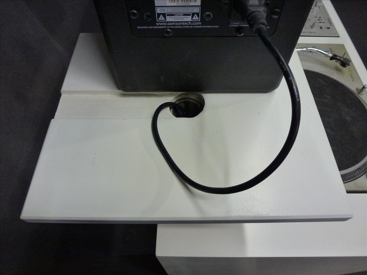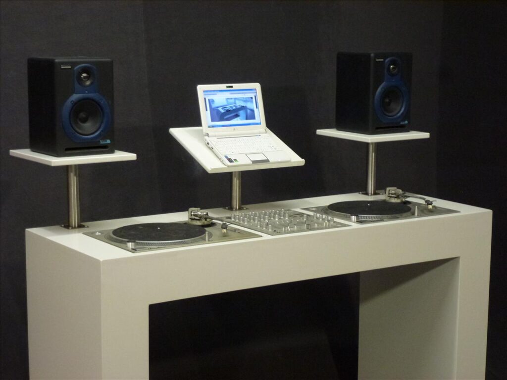 Uw monitorspeakers en controllers en/of laptop kunt u kwijt op de stands die op dit meubel te bevestigen zijn. Stands van RVS waarbij de bekabeling door de stand heen, uit het zicht dus, naar het werkvlak wordt geleid.